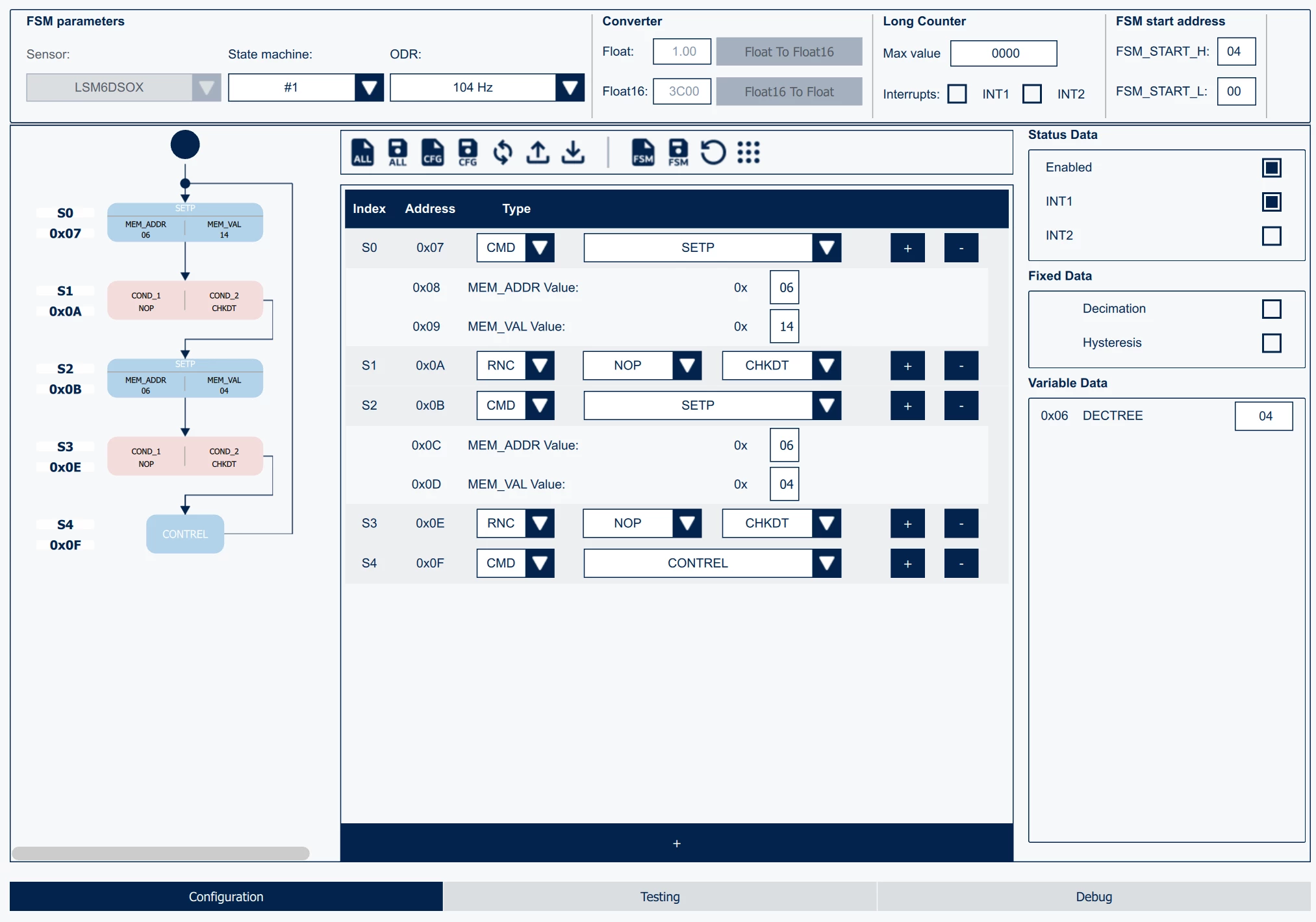 Now the project has 2 decision trees which detect different type of gesture. Both are working fine. In FSM, It program to detect 2 results from the decision tree. I use SETP command to change the DECTREE variable to check other decision tree address and value. But when upload the config, it doesn't work.