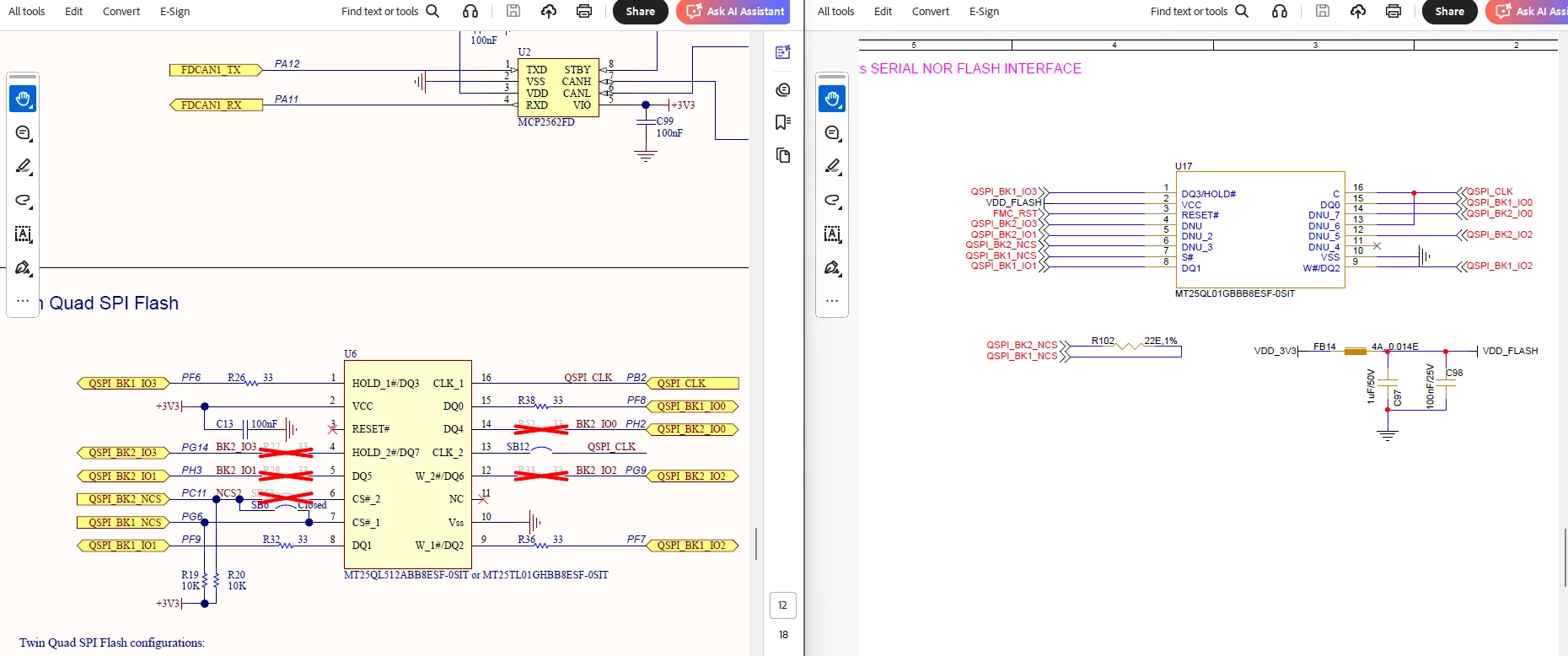 I’m working on a custom PCB based on STM32H757BIT6, conceptually similar to the STM32H747I-EVAL board. The original EVAL board uses a Micron MT25TL01G (dual-die) QSPI flash on BK1_CS (PG6). On my board, the flash is replaced with MT25QL01G (single-die) and connected to BK2_NCS (PC11).