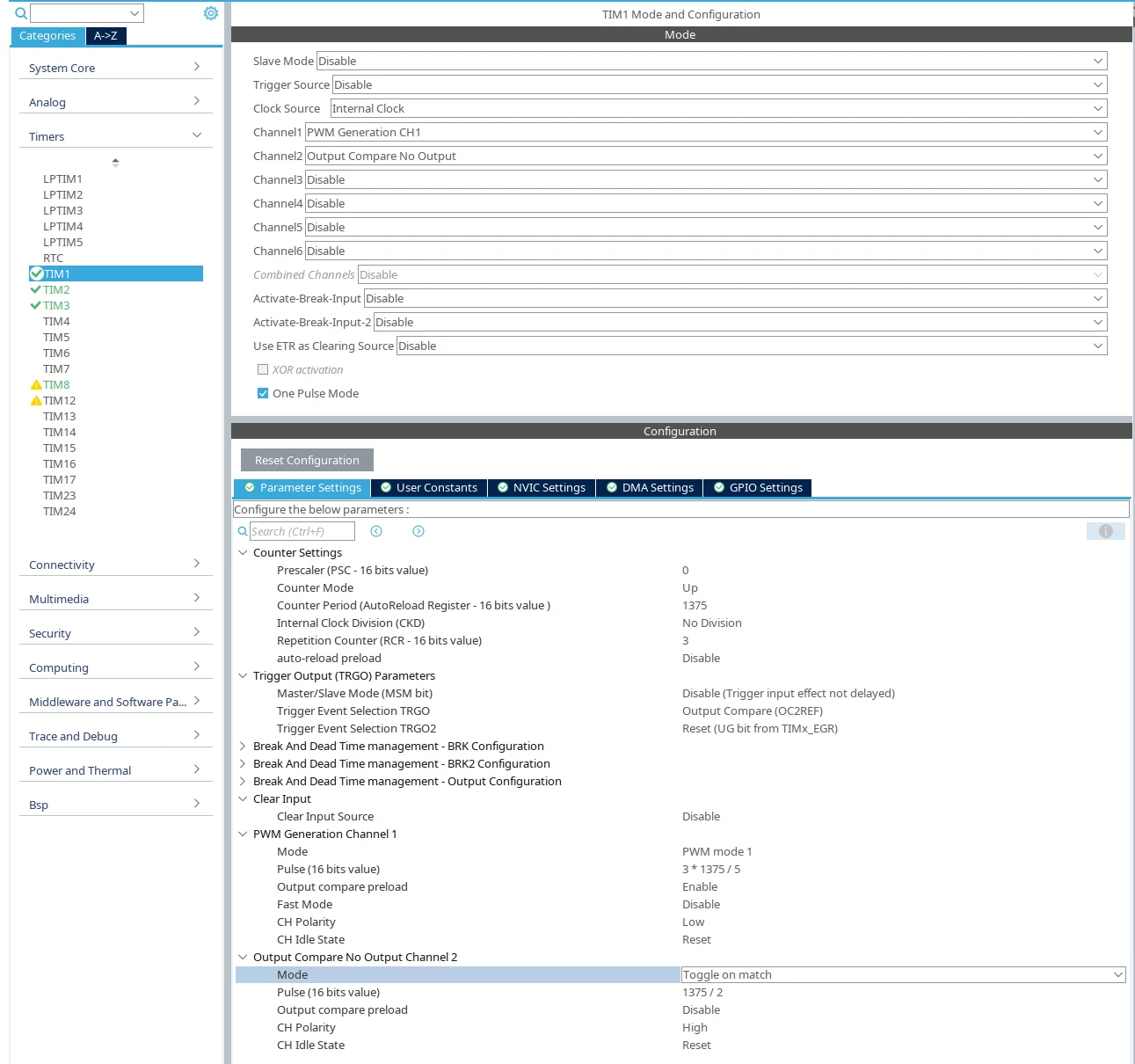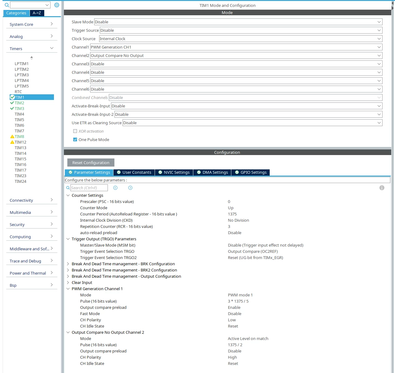 TIM1 acts as the master timer having channel 1 in 'PWM Generation CH1' as the first output and channel 2 in 'Output Compare No Output' for the phase-shift. TRGO is configured as 'Output Compare (OC2REF)'. 'One Pulse Mode' is checked for this timer.