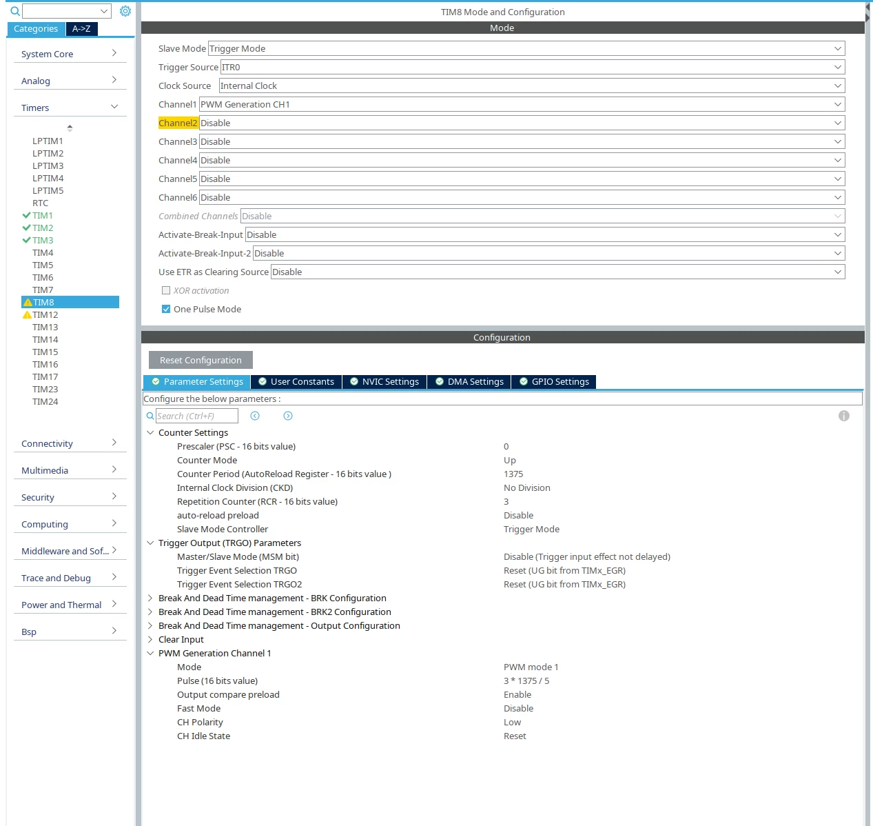 TIM8 is the slave timer in 'Trigger Mode' with Trigger Source 'ITR0' which connects to TIM1. Channel 1 is configured as 'PWM Generation CH1' for the system's second output. This timer is also in 'One Pulse Mode'.